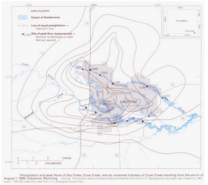 The NWS Forecast Office at the Cheyenne municipal airport recoreded 6.06 inches of rain in just over 3 hours between 7PM and 10PM. Elsewhere in and around Cheyenne rainfall from the storm totaled between 2 to 6 inches. Around 7PM cars and trucks were reported floating down Dry Creek in northwest Cheyenne. By 7:30PM, in addition to blinding rain, hail up to two inches in diameter and winds up to 70 mph were occurring in the Cheyenne area. The hail was piled up 4 to 8 feet deep by flood waters in some parts of Cheyenne. Flood waters in the city were at their apex from 7PM to 10PM, Dry Creek became a raging torrent throughout northern Cheyenne. 10 to 12 deaths occurred along Dry Creek when people were swept away in their cars as they tried to cross flooded streets. Flood Map of Rainfall amounts and water flow rates. ![]() |